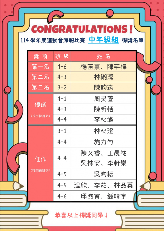 【恭喜】114學年度運動會海報比賽中年級組得獎名單