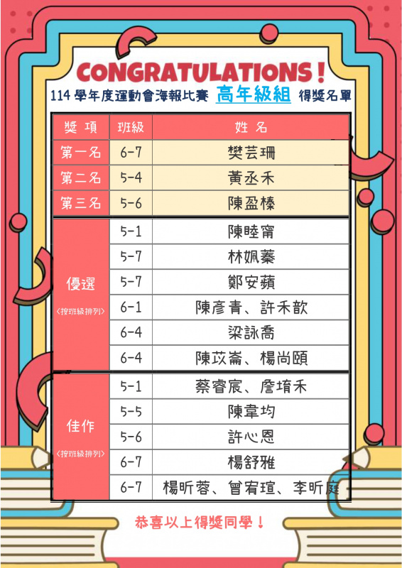 【恭喜】114學年度運動會海報比賽高年級組得獎名單