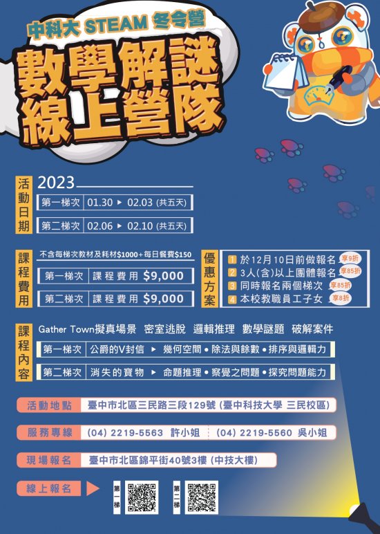 一、時間:112年1月30日至2月10日,課程詳細資訊請至中科大推廣部網站查詢。https://extension.nutc.edu.tw/