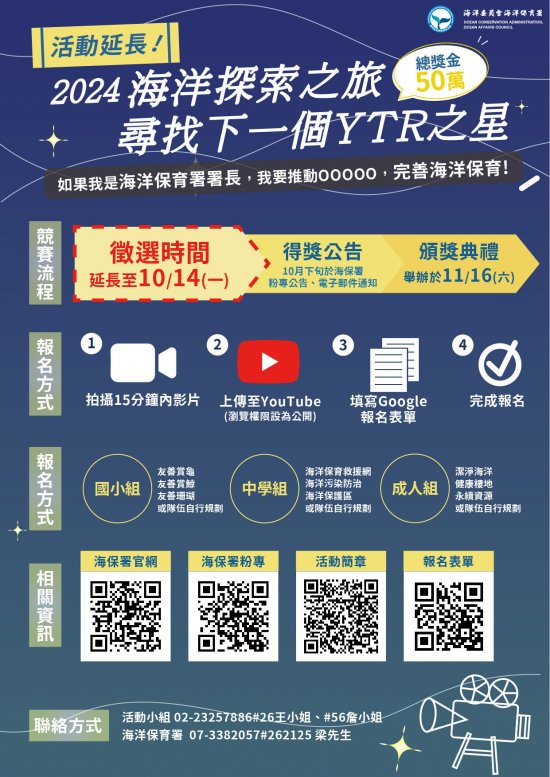 二、旨揭活動拍攝主題以「如果我是海洋保育署署長,我要推動○○○○○,完善海洋保育」,分為國小組、中學組及成人組競賽,報名期間自即日起至113年10月14日止,活動總獎金為新臺幣50萬元整。
