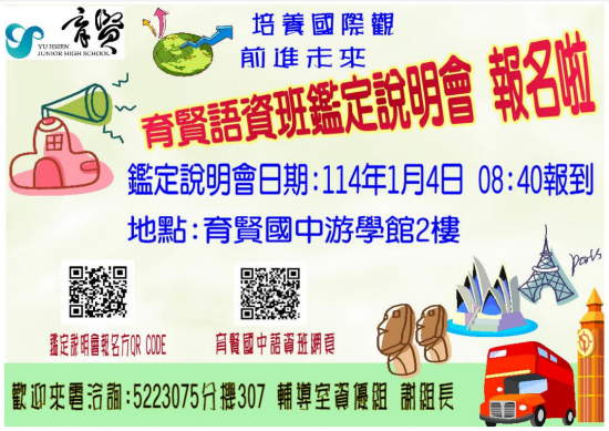 一、資優課程與鑑定入學說明會擬訂於114年1月4日(週六)上午9時,於育賢國中游學館二樓辦理。