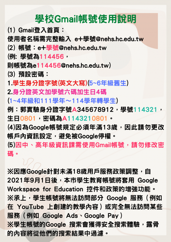 (例: 學號為114456,則帳號為 e114456@nehs.hc.edu.tw )