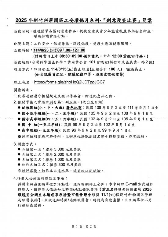 一、活動時間:114年8月23日(六)09:00-12:00(請於08:30~09:00領取畫紙,12:00前繳回作品。)