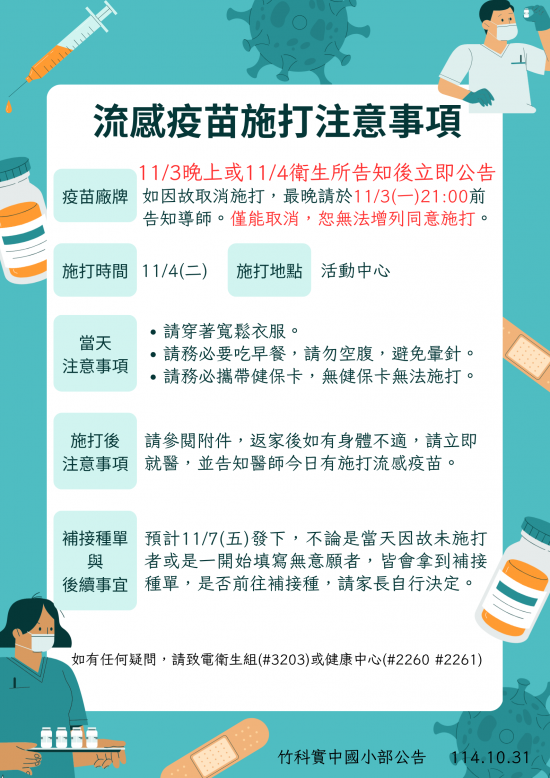本校國小部訂於114/11/4(二)上午施打114學年度流感疫苗,施打前後的注意事項請參考附件。
