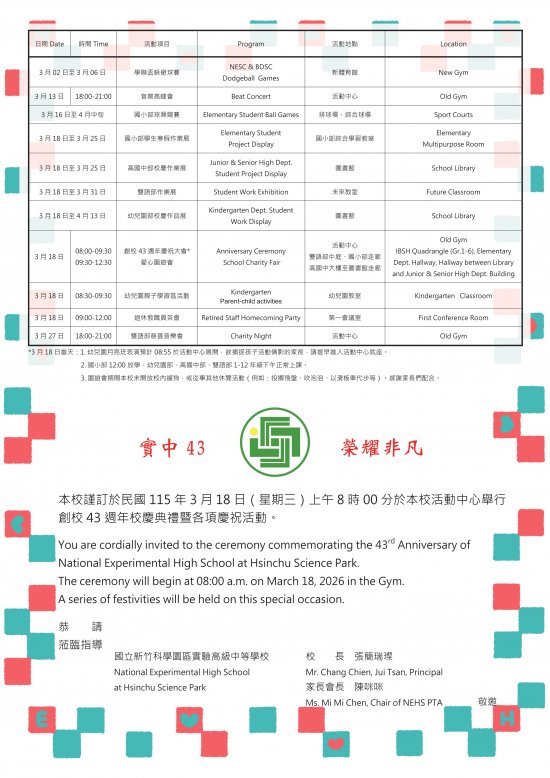 1.校慶43週年邀請卡與活動內容如附件,歡迎家長們共襄盛舉。