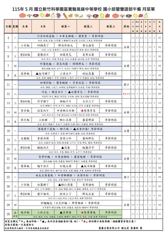 115年5月份午餐菜單