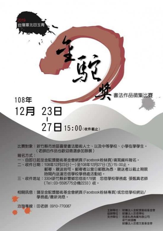 2019 台灣塞北田玉青「金駝獎」書法作品徵集比賽辦法