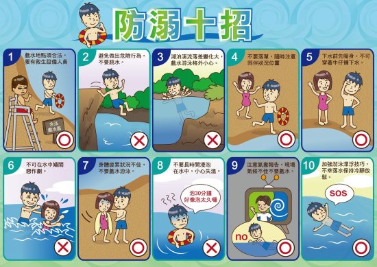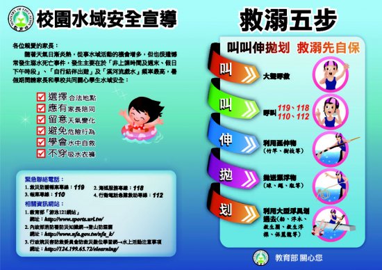 因應暑期學生參與水域活動頻率漸增,為落實水域安全宣導,避免溺水事件一再發生,為了讓同學們方便記誦,教育部提出「救溺五步、防溺十招」(參考下方說明及附圖):
